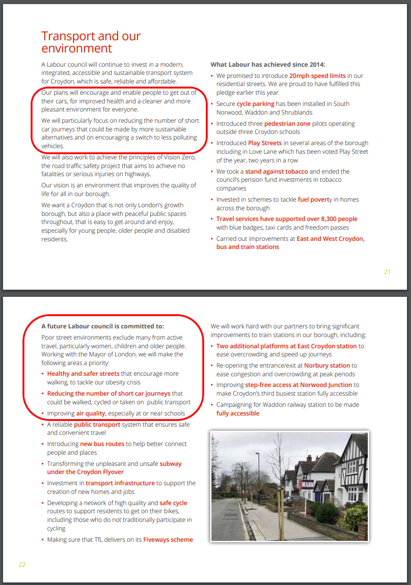 Now lets look at the two council wards on Auckland Island: Crystal Palace and Upper Norwood and South Norwood. As all six councillors come from the Labour Party (winning with hefty majorities only two years ago), lets revisit what they promised us in their election manifesto. Under Transport and our environment:
