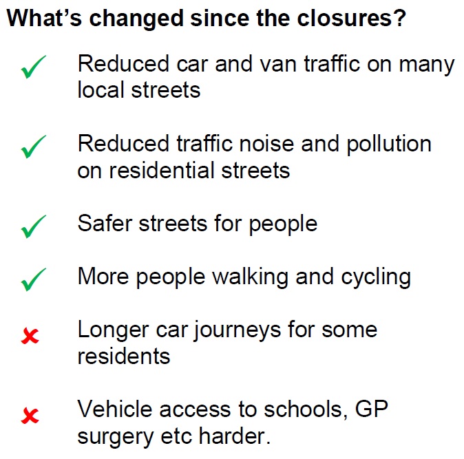 The changes quickly reduced traffic around the affected streets, bringing down air pollution, and with it the day-long noise and vibration from rat-running traffic.