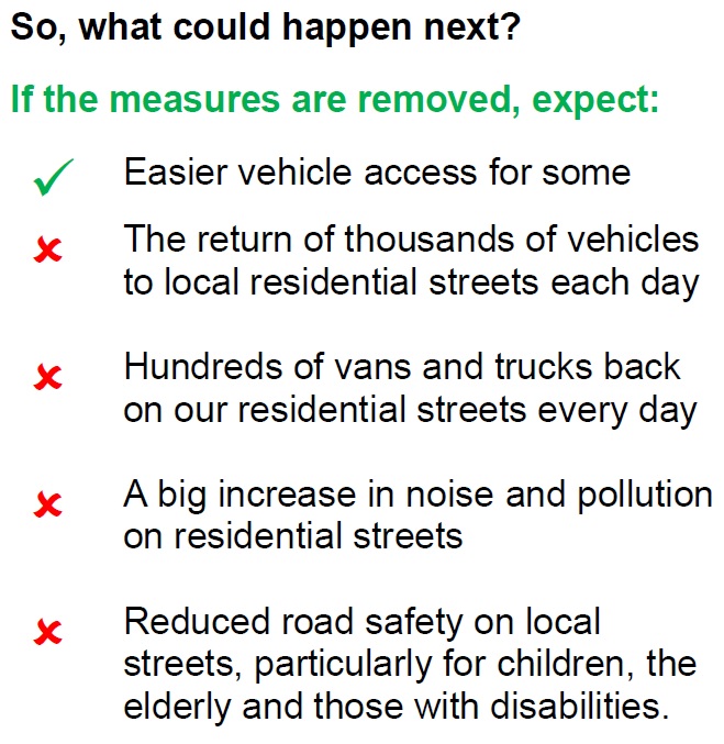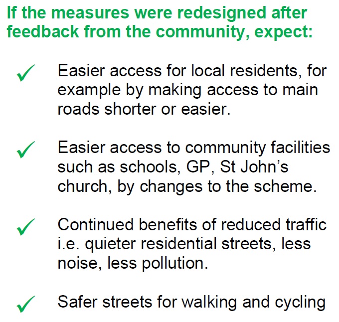 Whether you’re enjoying the safe, peaceful, less-polluted neighbourhood brought about by the measures as they stand, or want to suggest changes to improve them, your view counts.