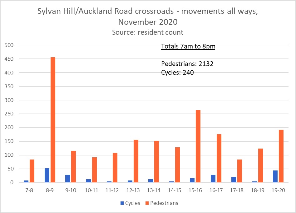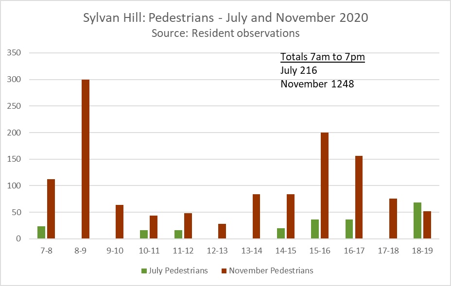 First, what is the most likely reason why there is more walking and cycling than in the summer in Sylvan Hill? In July, the street was being used by several hundred motor vehicles an hour for most of the day, with associated poor air quality and noise. Worse, driver behaviour was often poor, with speeding, driving and parking on pavements, and aggression towards cyclists and pedestrians. It is highly unlikely that any parent would have contemplated transporting young children by cycle.