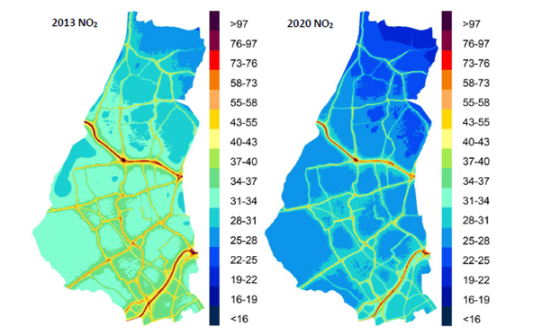Air quality on adjoining roads and in the two town centres is beyond doubt frequently poor. However, if, as we argue above, the heavy traffic and congestion which causes it cannot reliably be attributed to the LTN, opening the LTN roads again to rat-running would not assist. The Waltham Forest mini-Holland, including progressively rolling out LTNs, has reduced air pollution on 90 % of the borough’s streets without worsening it on the main roads. (Figure 17)[xlviii]